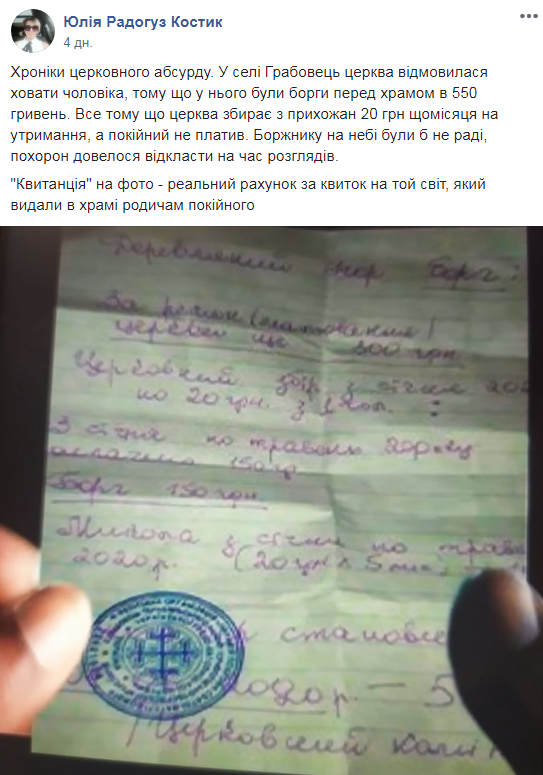 “Хроніки церковного абсурду. У селі Грабовець церква відмовилася ховати чоловіка, тому що у нього були борги перед храмом в 550 гривень. Все тому що церква збирає з прихожан 20 грн щомісяця на утримання, а покійний не платив. Боржнику на небі були б не раді, похорон довелося відкласти на час розглядів. “Квитанція” на фото – реальний рахунок за квиток на той світ, який видали в храмі родичам покійного“, – зазначила у дописі на сторінці спільноти “Інформаційна війна” у ФБ Юлія Радогуз Костик.
