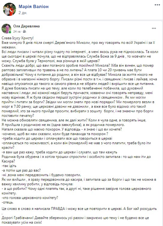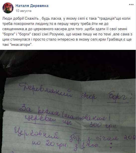 “Скажіть, будь ласка, в селі є така” традиція “, що, коли треба поховати людину, то в першу чергу треба йти не до священика, а до церковного касиру для того, щоб здати його земні борги і борги його сім’ї. Розумію, що , може, пишу не по темі, але сама з цим зіткнулася і просто стало цікаво: в селах крім Грабовця є ще такі “інкасатори”, – написала жінка.