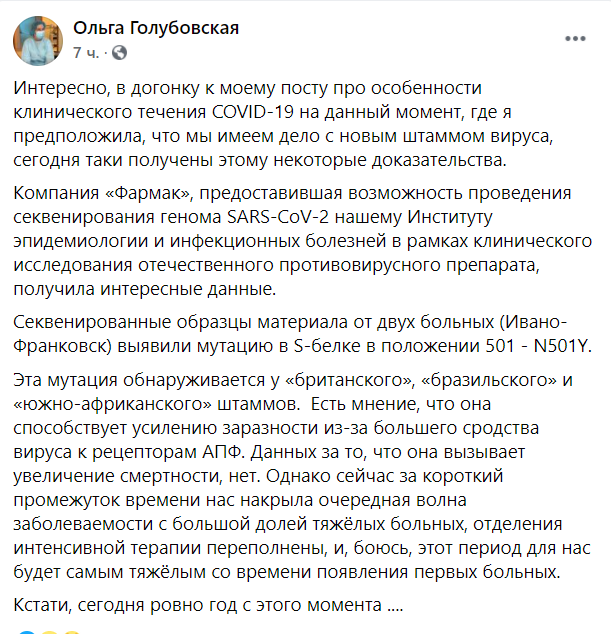 Провідний інфекціоніст МОЗ Ольга Голубовська на своїй сторінці в Facebook зазначила, що мутація вірусу, яку виявили у цих пацієнтів, зазвичай характерна для “британського”, “бразильського” та “південноафриканського” штамів коронавірусу.