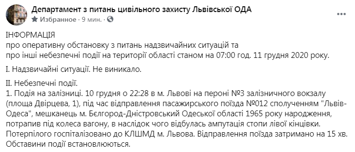10 грудня о 22:28 в м. Львові на пероні №3 залізничного вокзалу (площа Двірцева, 1), під час відправлення пасажирського поїзда №012 сполученням “Львів-Одеса”, мешканець м. Бєлгород-Дністровський Одеської області 1965 року народження, потрапив під колеса вагону, в наслідок чого відбулась ампутація стопи лівої кінцівки.