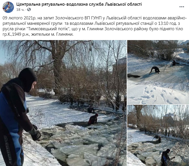 Як пише «Четверта студія», у ЦРВС у Львівській області повідомили, що 9 лютого на запит Золочівського ВП ГУНП у Львівській області водолазами аварійно-рятувальної маневреної групи та водолазами Львівської рятувальної станції о 13:10 год. з русла річки “Тимковецький потік”, що у м. Глиняни Золочівського району було піднято тіло жінки 1949 р.н., жительки м. Глиняни.