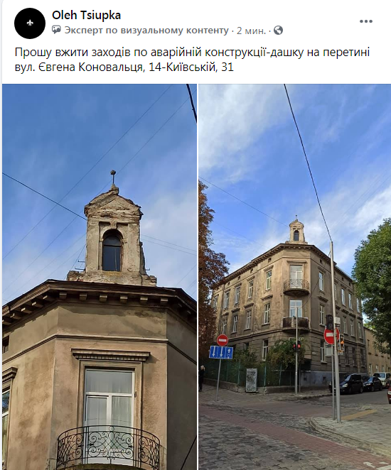«Прошу вжити заходів по аварійній конструкції-дашку на перетині вул. Євгена Коновальця, 14 -Київській, 31», – зазначила у зверненні на «Гарячу лінію міста Львова» Oleh Tsiupka, яка оприлюднила світлини з місця події.