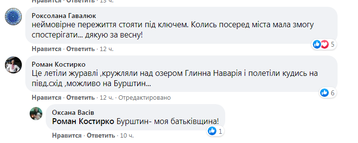 «Це летіли журавлі ,кружляли над озером Глинна Наварія і полетіли кудись на півд.схід ,можливо на Бурштин…», – написав у коментарі до оприлюднених у ФБ світлин Роман Костирко.