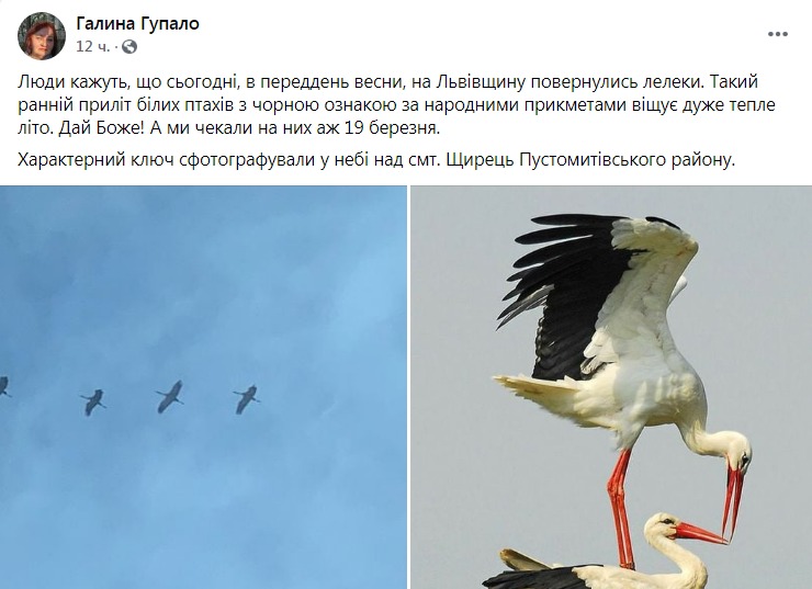 “Люди кажуть, що сьогодні, в переддень весни, на Львівщину повернулись лелеки. Такий ранній приліт білих птахів з чорною ознакою за народними прикметами віщує дуже тепле літо. Дай Боже! А ми чекали на них аж 19 березня. Характерний ключ сфотографували у небі над смт. Щирець Пустомитівського району”,- зазначила у коментарі до світлини Галина Гупало у ФБ.