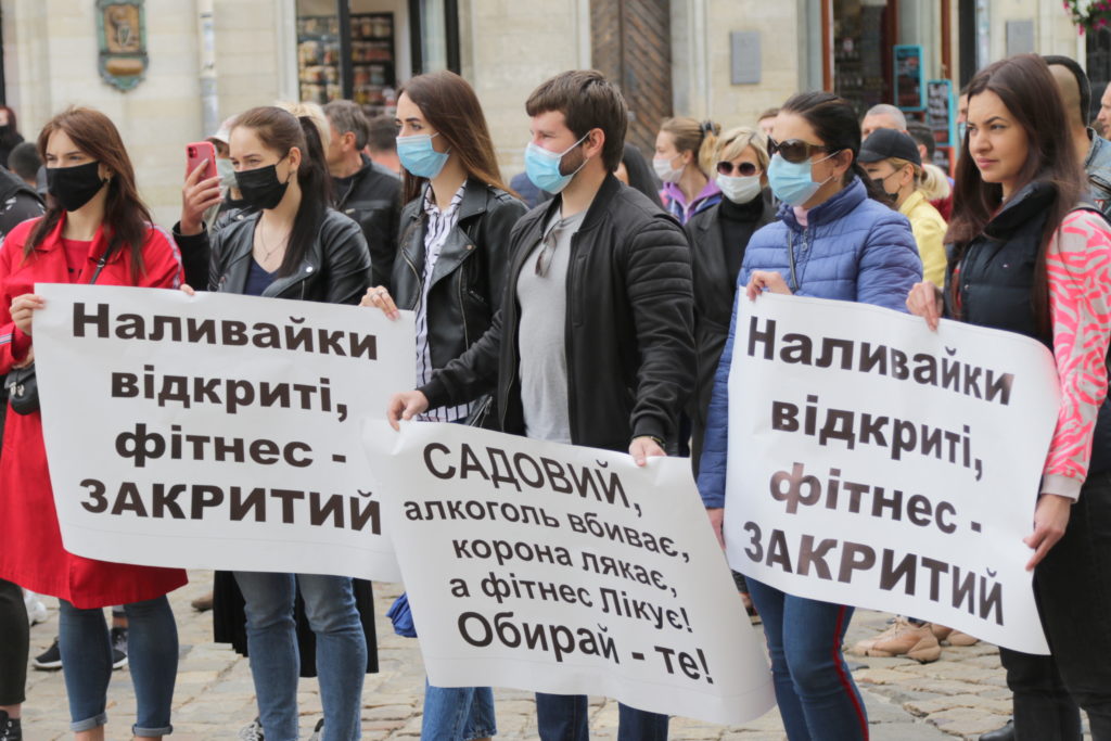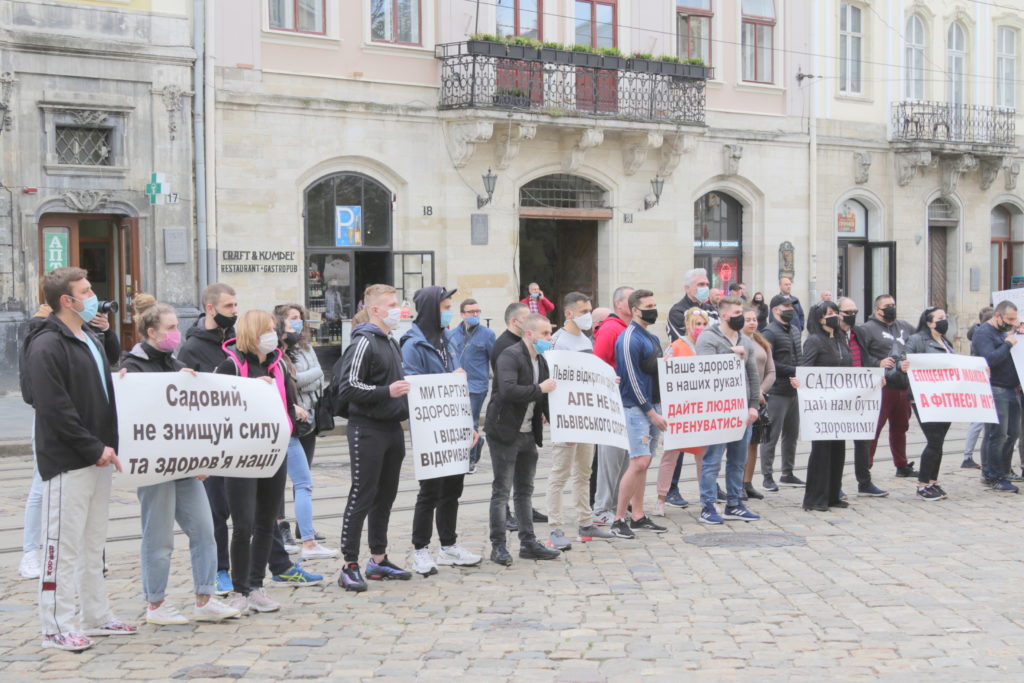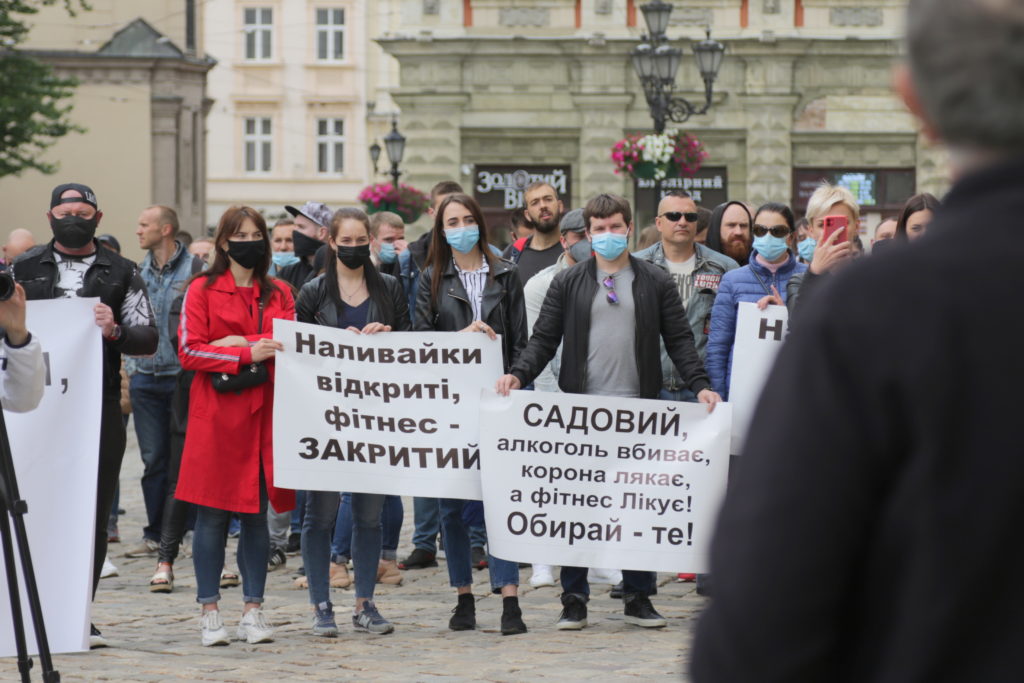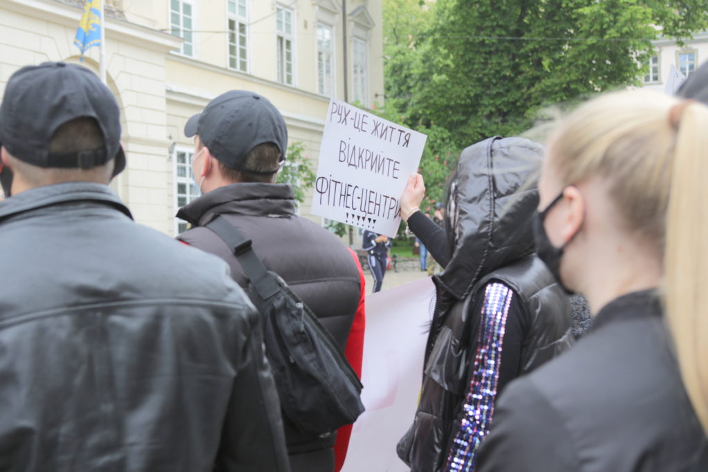 Активісти принесли з собою численні плакати з красномовними написами, де, серед іншого, звертають увагу львівської влади на те, що місця для розпиття алкоголю вже працюють, а от займатись спортом у спортзалах та фітнесцентрах – поза законом.