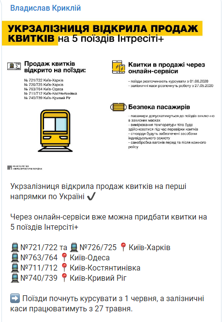 Як пише «Четверта студія» з посиланням на УНІАН, квитки можна придбати на сайті УЗ. Мобільний додаток поки продаж не здійснює, а відкриття квиткових кас анонсували на 27 травня.