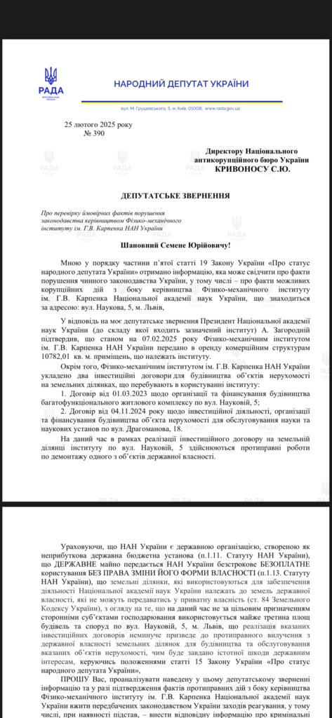 Як йдеться у зверненні, із ЗМІ отримано інформацію, яка може свідчити про факти порушення чинного законодавства України, у тому числі – про факти можливих корупційних дій з боку керівництва Фізико-механічного інституту ім. Г.В. Карпенка Національної академії наук України, що знаходиться за адресою: вул. Наукова, 5, м. Львів