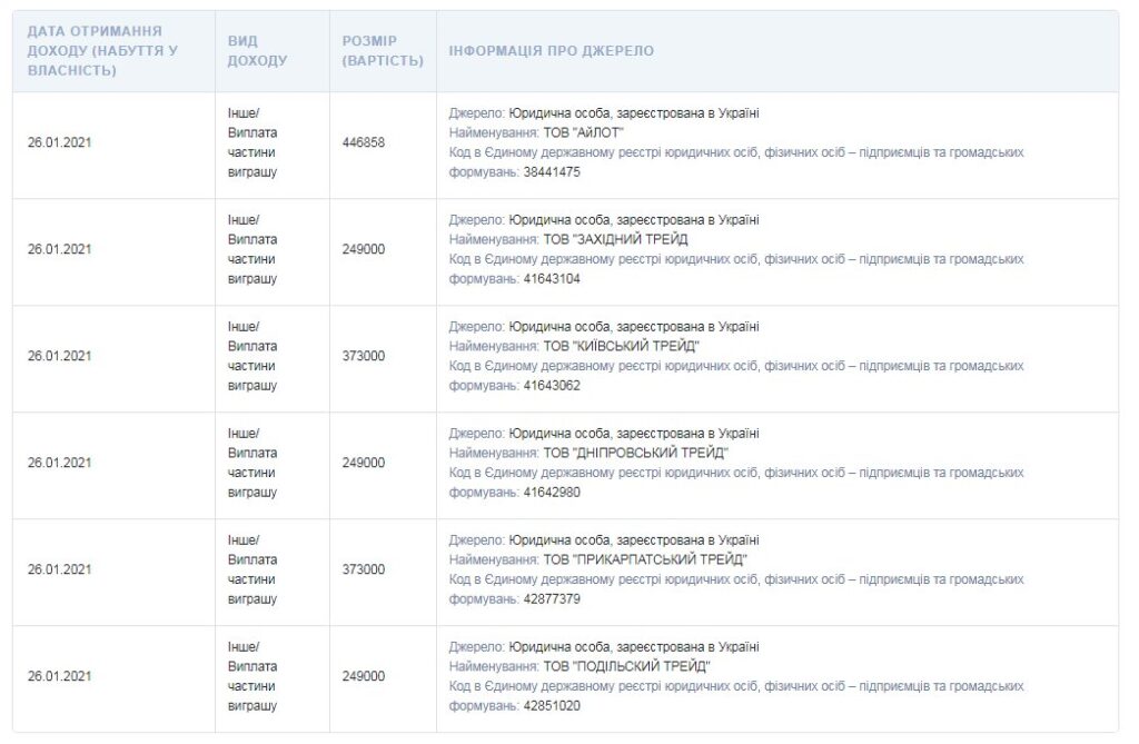 Народний депутат від партії “Слуга народу”, заступник голови комітету з правоохоронної діяльності Максим Павлюк задекларував два мільйони гривень, як лотерейний виграш. Пів року тому Павлюк вже декларував подібний “виграш в лотерею” – 900 тисяч гривень.