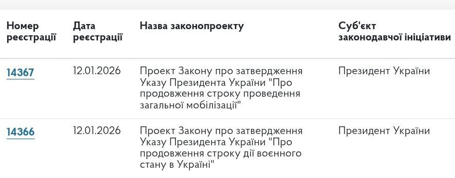 Президент України Володимир Зеленський вніс до парламенту два законопроекти: про продовження строку дії воєнного стану та продовження строку проведення загальної мобілізації на 90 днів — до 4 травня 2026 року