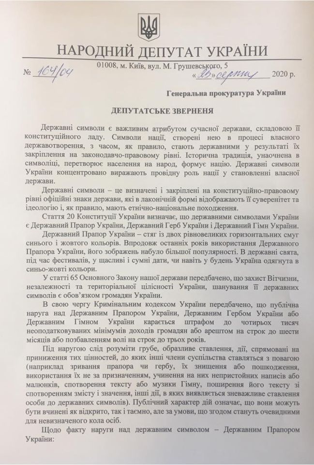 Нардеп Софія Федина звернулася на ГПУ щодо наруги над державним прапором України під час офіційних заходів до Дня Незалежності України.
