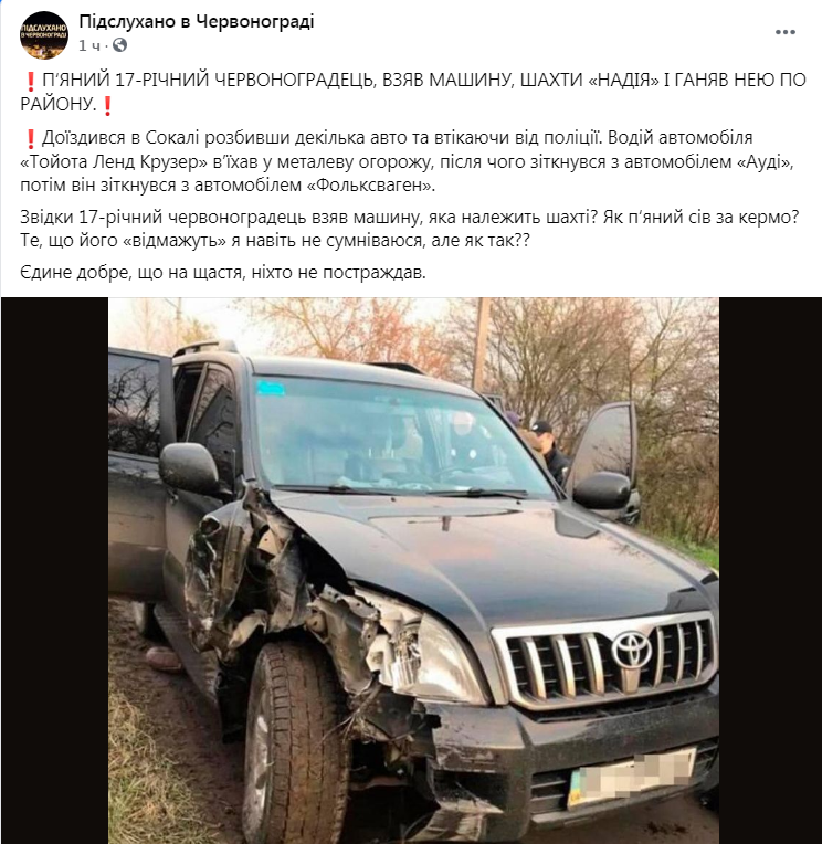 Як пише «Четверта студія», на сторінці «Підслухано в Червонограді» у ФБ, зазначається «доїздився в Сокалі розбивши декілька авто та втікаючи від поліції. Водій автомобіля «Тойота Ленд Крузер» в’їхав у металеву огорожу, після чого зіткнувся з автомобілем «Ауді», потім він зіткнувся з автомобілем «Фольксваген».