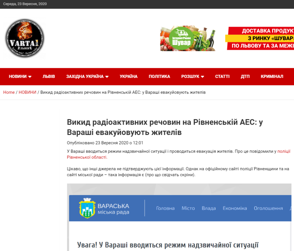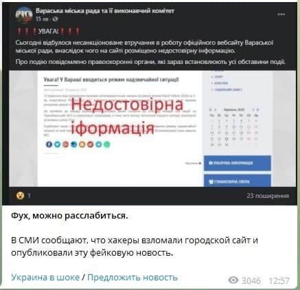 Невідомі поширили фейк про викид радіоактивних речовин на Рівненській АЕС: у Вараші вводиться режим надзвичайної ситуації – саме таке повідомлення з’явилось на сторінці Вараської міської ради, провисіло кілька хвилин і зникло. Згодом з’явилась повідомлення про те, що сторінку зламали.