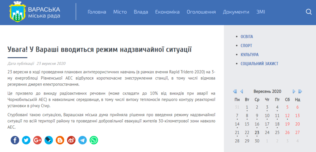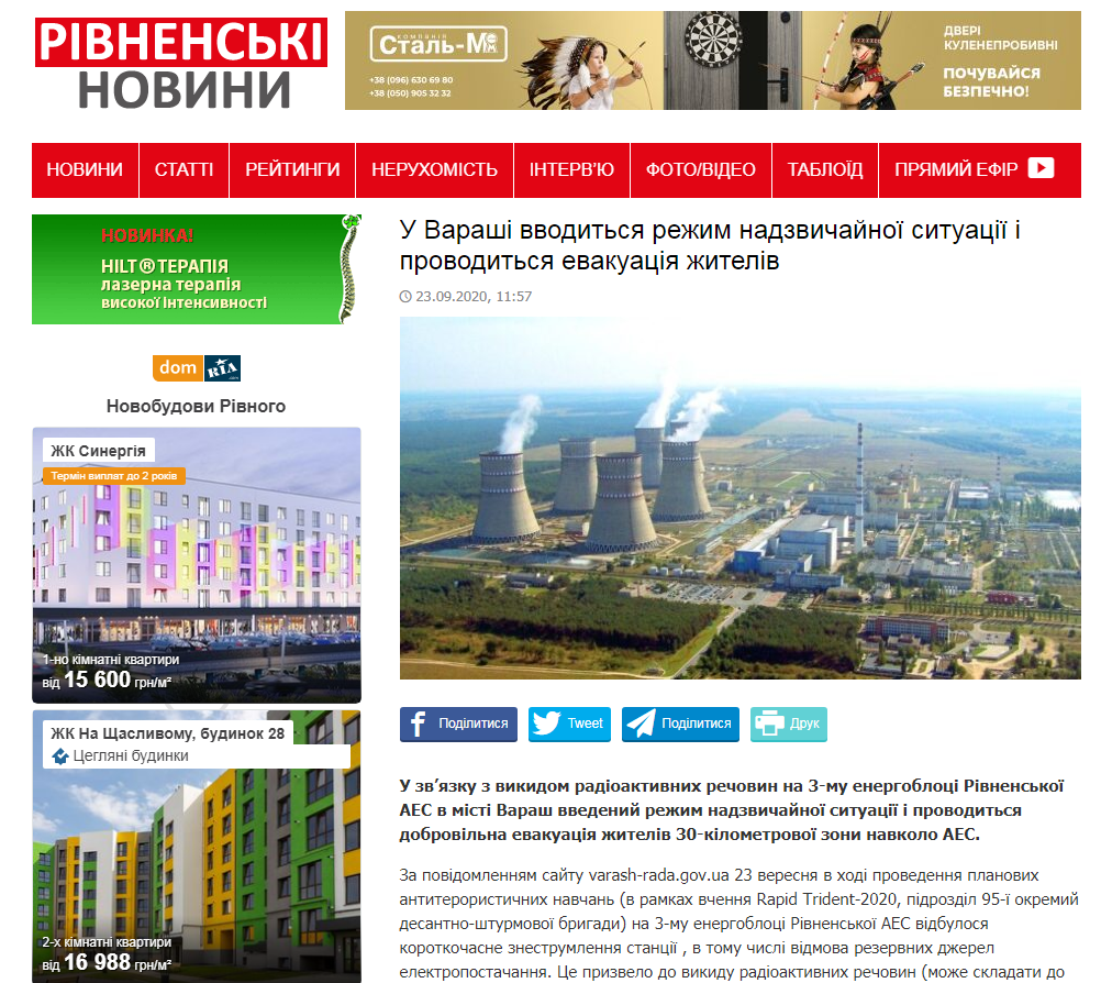 Як пише «Четверта студія», на сайті Вараської міської “думи” повідомлялось, що 23 вересня в ході проведення планових антитерористичних навчань (в рамках Rapid Trident-2020) на 3-му енергоблоці Рівненської АЕС відбулося короткочасне знеструмлення станції, в тому числі відмова резервних джерел електропостачання.