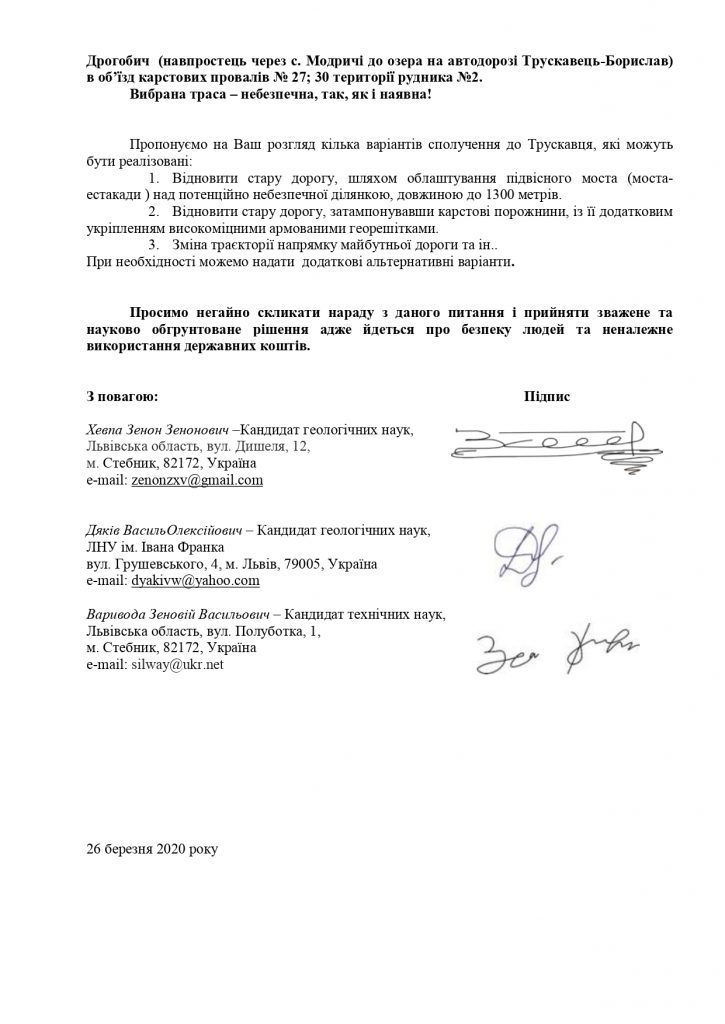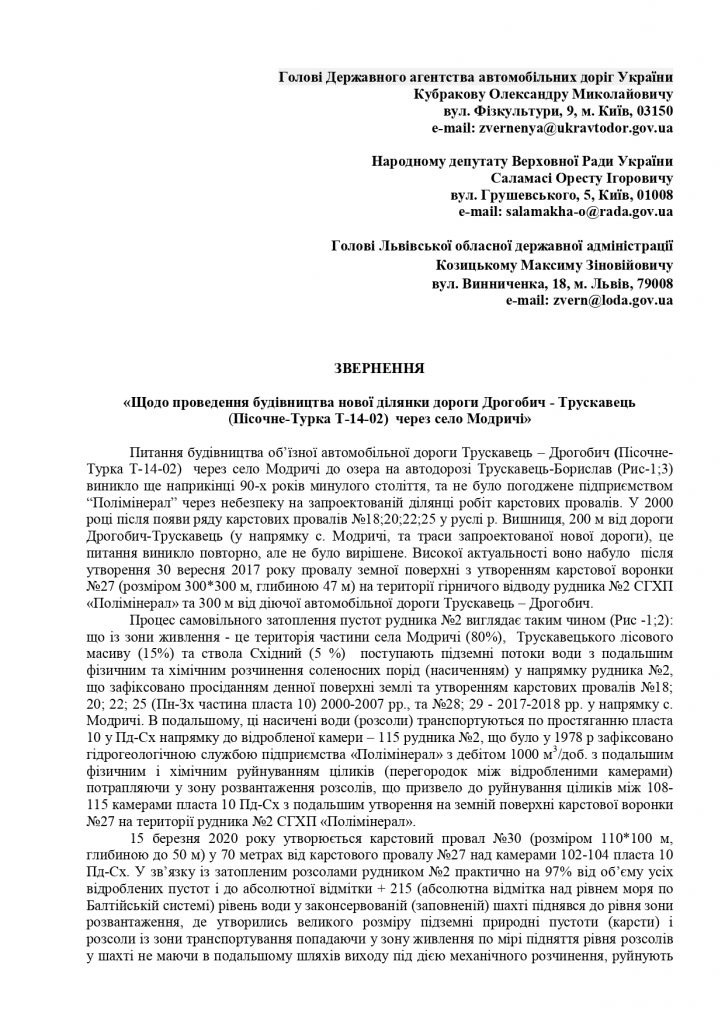 Як зазначається, у зверненні, зокрема, йдеться про те, що питання об’їзної автомобільної дороги Трускавець – Дрогобич через с. Модричі до озера на автодорозі Трускавець-Борислав виникло ще наприкінці 90-х років минулого століття. Однак не було погоджене підприємством «Полімінерал» через небезпеку на запроєктованій ділянці робіт карстових провалів.