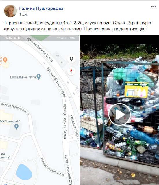 “Тернопільська біля будинків 1а-1-2-2а, спуск на вул. Стуса. Зграї щурів живуть в щілинах стіни за смітниками. Прошу провести дератизацію!”,- повідомила на “Гарячу лінію міста Львова” у ФБ Galina Pushkarova.