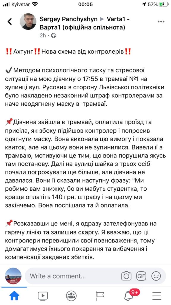 📌Дівчина зайшла в трамвай, оплатила проїзд та присіла, як збоку підійшов контролер і попросив одягнути маску. Вона виконала цю вимогу і показала квиток, але на цьому вони не зупинилися. Вивели її з трамваю, мотивуючи це тим, що вона порушила якусь там постанову. Далі на вулиці шайка з трьох осіб почали погрожувати ще більше, але дівчина не давалася. Вони її сказали наступну фразу: “Ми робимо вам знижку, бо ви мабуть студентка, то краще оплатіть 140 грн. штрафу і на цьому ми закінчемо. Вона поспішала та й оплатила.