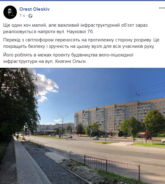 “Ще один хоч малий, але важливий інфраструктурний об’єкт зараз реалізовується напроти вул. Наукової, 7б. Перехід з світлофором переносять на протилежну сторону розриву. Це покращить безпеку і зручність на цьому вузлі для всіх учасників руху. Його роблять в межах проекту будівництва вело-пішохідної інфраструктури на вул. Княгині Ольги“, – зазначається у дописі Orest Oleskiv у ФБ.