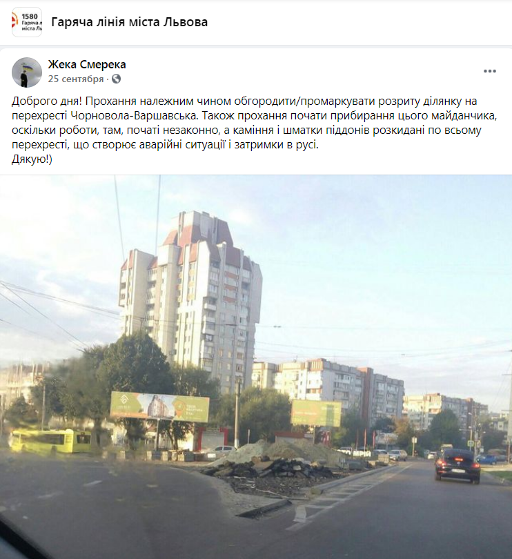 «Прохання належним чином обгородити/промаркувати розриту ділянку на перехресті Чорновола-Варшавська. Також прохання почати прибирання цього майданчика, оскільки роботи там початі незаконно, а каміння і шматки піддонів розкидані по всьому перехресті, що створює аварійні ситуації і затримки в русі»,- зазначає Жека Смерека у зверненні на «Гарячу лінію міста Львова» у ФБ.