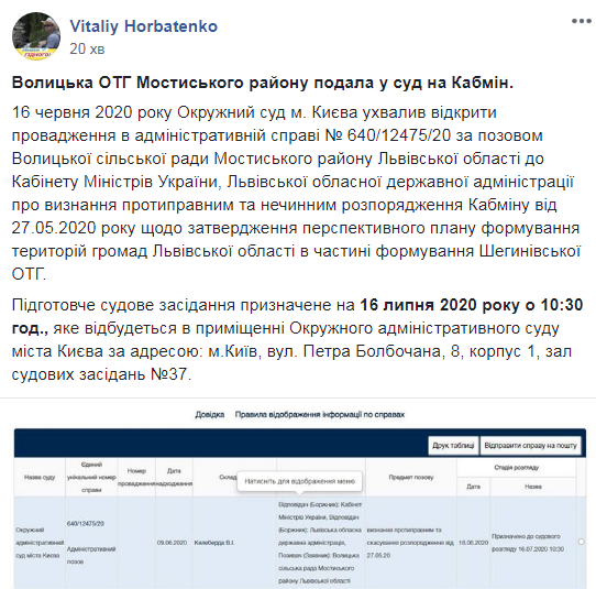 Як зазначається, 16 червня 2020 року Окружний суд м. Києва ухвалив відкрити провадження в адміністративній справі № 640/12475/20 за позовом Волицької сільської ради Мостиського району Львівської області до Кабінету Міністрів України, Львівської обласної державної адміністрації про визнання протиправним та нечинним розпорядження Кабміну від 27.05.2020 року щодо затвердження перспективного плану формування територій громад Львівської області в частині формування Шегинівської ОТГ.
