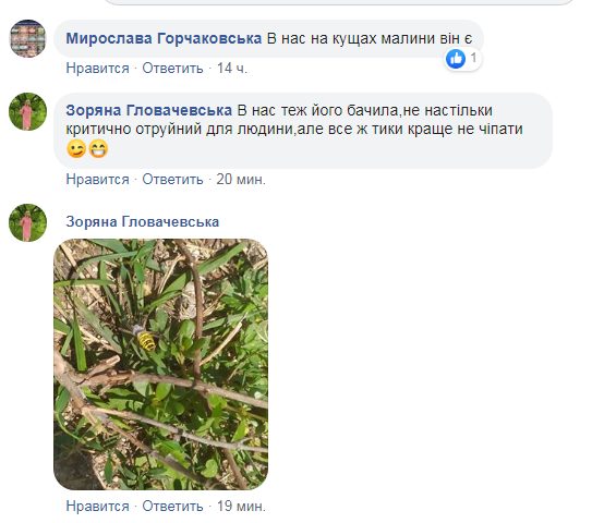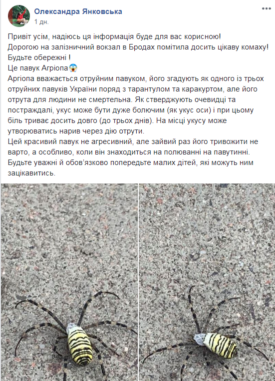 «Дорогою на залізничний вокзал в Бродах помітила досить цікаву комаху. Будьте обережні. Це павук Агріопа. Він вважається отруйним павуком, його згадують як одного із трьох отруйних павуків України поряд з тарантулом та каракуртом, але його отрута для людини не смертельна. Як стверджують очевидці та постраждалі, укус може бути дуже болючим (як укус оси) і при цьому біль триває досить довго (до трьох днів). На місці укусу може утворюватись нарив через дію отрути.