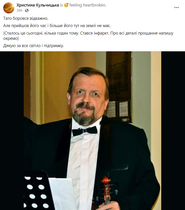 «Тато боровся відважно. Але прийшов його час і більше його тут на землі не має. Стався інфаркт. Про всі деталі прощання напишу окремо. Дякую за все світло і підтримку», – написала Христина Кульчицька.