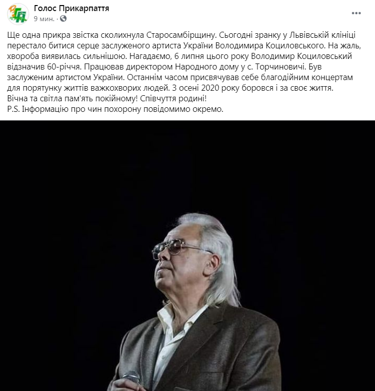 «Ще одна прикра звістка сколихнула Старосамбірщину. Сьогодні зранку у Львівській клініці перестало битися серце заслуженого артиста України Володимира Коциловського. На жаль, хвороба виявилась сильнішою. Нагадаємо, 6 липня цього року Володимир Коциловський відзначив 60-річчя. Працював директором Народного дому у с. Торчиновичі. Був заслуженим артистом України. Останнім часом присвячував себе благодійним концертам для порятунку життів важкохворих людей. З осені 2020 року боровся і за своє життя. Вічна та світла пам’ять покійному! Співчуття родині! Інформацію про чин похорону повідомимо окремо», – зазначається у повідомленні.