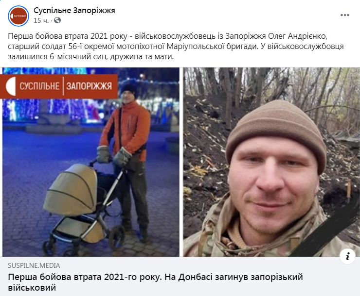 «Перша бойова втрата 2021 року – військовослужбовець із Запоріжжя Олег Андрієнко, старший солдат 56-ї окремої мотопіхотної Маріупольської бригади. У військовослужбовця залишився 6-місячний син, дружина та мати. Як повідомили в обласному військкоматі, прощання з бійцем відбудеться 14 січня на Алеї захисників у Запоріжжі. “З великим сумом та болем повідомляємо, що 11 січня в районі Операції об’єднаних сил під час виконання бойового завдання отримав вогнепальне кульове поранення не сумісне з життям наш побратим старший солдат Андрієнко Олег Віталійович 22.08.1983 року народження”, – йдеться у повідомленні на сторінці мотопіхотної бригади. У 56-й окремій мотопіхотній Маріупольській бригаді висловили співчуття родині загиблого бійця. У військовослужбовця залишився 6-місячний син Тимур, дружина Марія та мати»,- пише «Суспільне Запоріжжя».