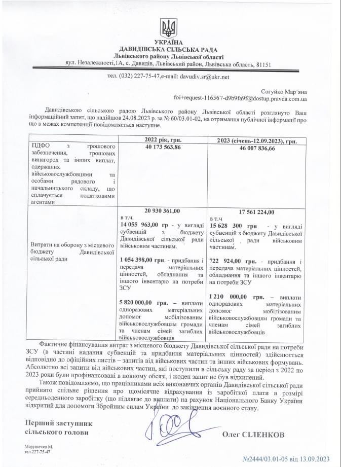 Та згідно інформації отриманої в запиті на доступ до публічної інформації з початку повномасштабного вторгнення Давидівська ТГ отримала близько 86 млн гривень з так званого «військового ПДФО», а витратили на потреби військових близько 36 млн гривень.