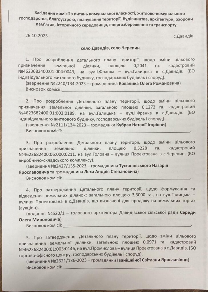 Давидівська ОТГ розробили детальний план, згідно з яким гектари землі мали б виставити на продаж, не зважаючи на те, що земля перебувала в користуванні жителів громади впродовж багатьох років, а громадських слухань, зі слів громадськості, як таких не було.