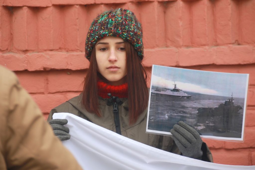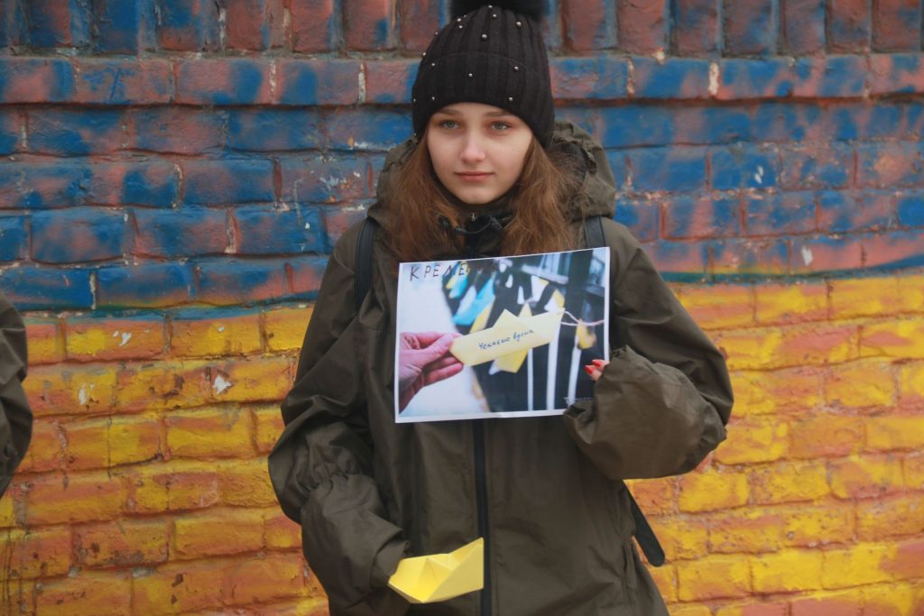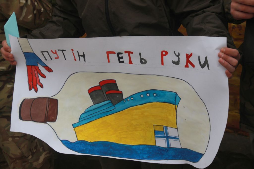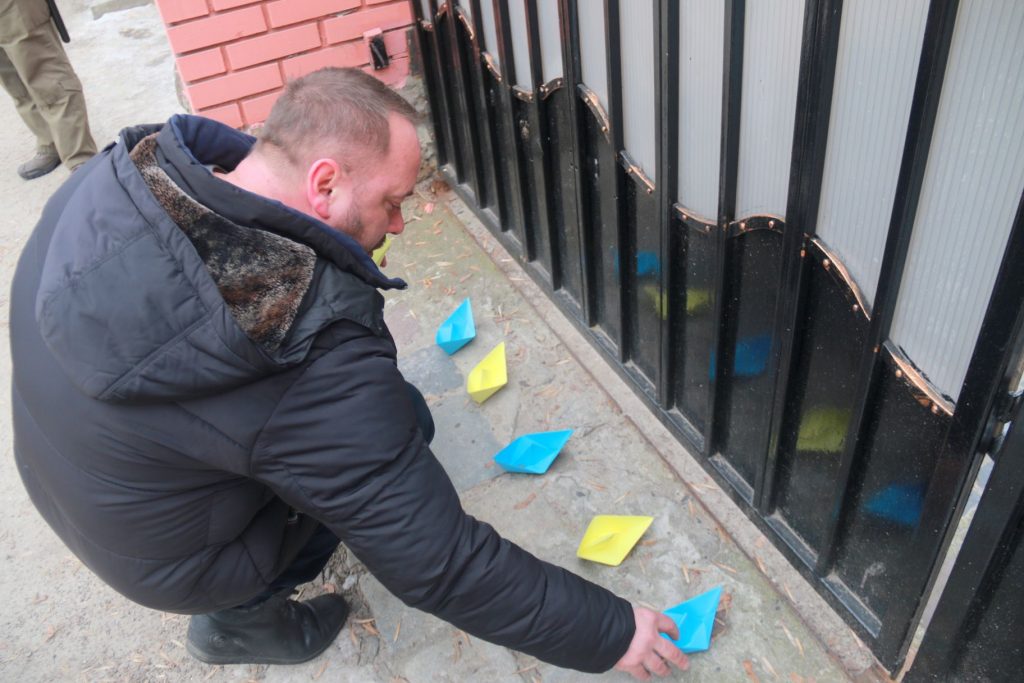 У ході акції активісти не лише принесли зі собою красномовні плакати “Путін, геть руки”, а й розклали під стінами консульства жовті та сині паперові кораблики .