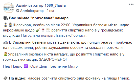 Як повідомляється, що управління безпеки міста надає інформацію щодо розпиття спиртних напоїв у громадських місцях до Патрульної поліції Львівської області, яка прибуває на повідомлення, робить зауваження особам та складає протоколи.