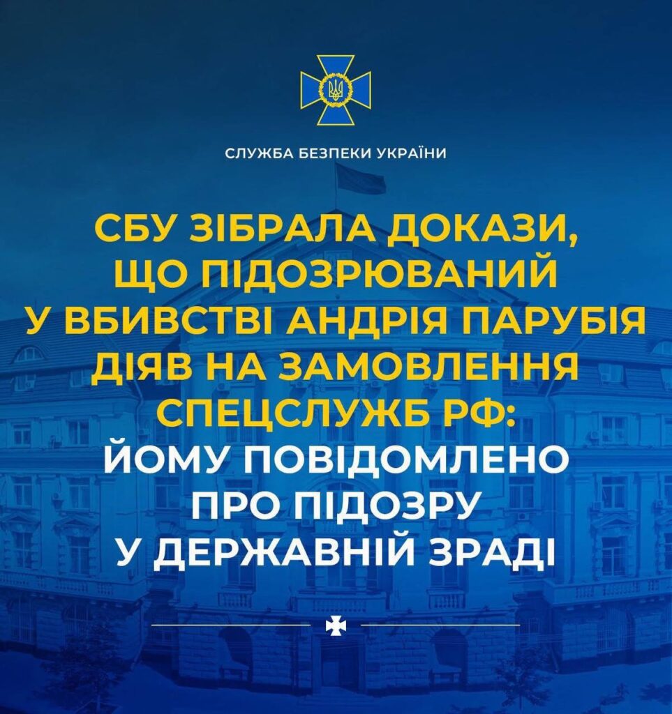 СБУ зібрала докази, що підозрюваний у вбивстві Андрія Парубія діяв на замовлення спецслужб рф: йому повідомлено про підозру у державній зраді