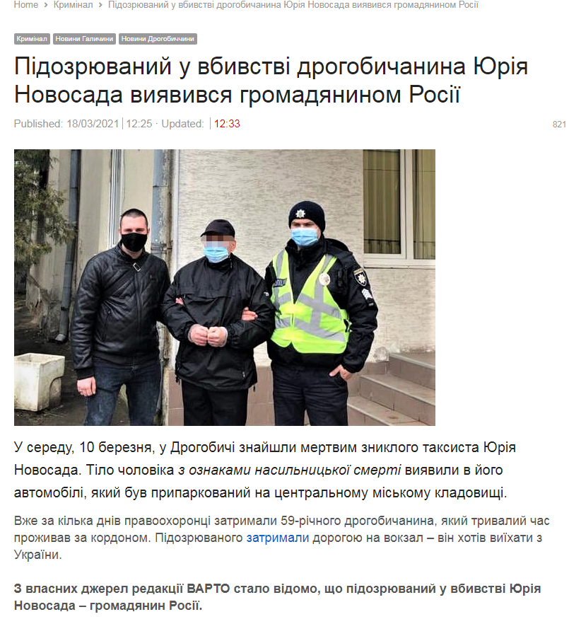 У середу, 10 березня, у Дрогобичі знайшли мертвим зниклого таксиста Юрія Новосада. Тіло чоловіка з ознаками насильницької смерті виявили в його автомобілі, який був припаркований на центральному міському кладовищі. Вже за кілька днів правоохоронці затримали 59-річного дрогобичанина, який тривалий час проживав за кордоном. Підозрюваного затримали дорогою на вокзал – він хотів виїхати з України. З власних джерел стало відомо, що підозрюваний у вбивстві Юрія Новосада – громадянин Росії.