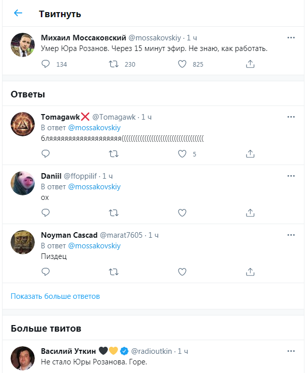 “Помер Юрій Розанов. Через 15 хвилин ефір. Не знаю, як працювати”, – написав Моссаковський.