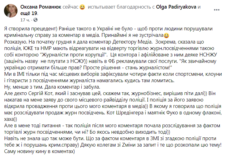 «На початку грудня я дала коментар Детектору Медіа. Зокрема, сказала що поліція, КЖЕ та НМР мають відреагувати на відверту торгівлю журналістськими посвідченнями такою собі конторою “Журналісти проти корупції”. Ця контора і афілійоване з ним деяке НСНЖУ (зацініть назву не плутати з НСЖУ)) навіть в ФБ рекламували свої послуги. “Як звичайному українцю отримати більше прав? Просте рішення – стань журналістом!”