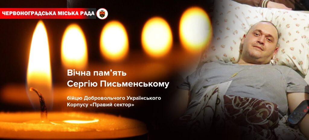 “Глибоко сумуємо з приводу смерті бійця Добровольчого Українського Корпусу «Правий сектор» Сергія Письменського. Сергій брав участь у бойових діях в зоні АТО в секторі «М» у складі 8-го окремого батальону «Аратта», де й отримав поранення. Після майже 5 років важкого лікування Сергій відійшов до вічності”, – зазначається у повідомленні.