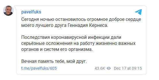“Сьогодні вночі зупинилося величезна добре серце мого найкращого друга Геннадія Кернеса. Наслідки коронавірусної інфекції дали серйозні ускладнення на роботу життєво важливих органів і систем його організму. Вічна пам’ять тобі, мій друже”, – написав Павло Фукс в Telegrame.