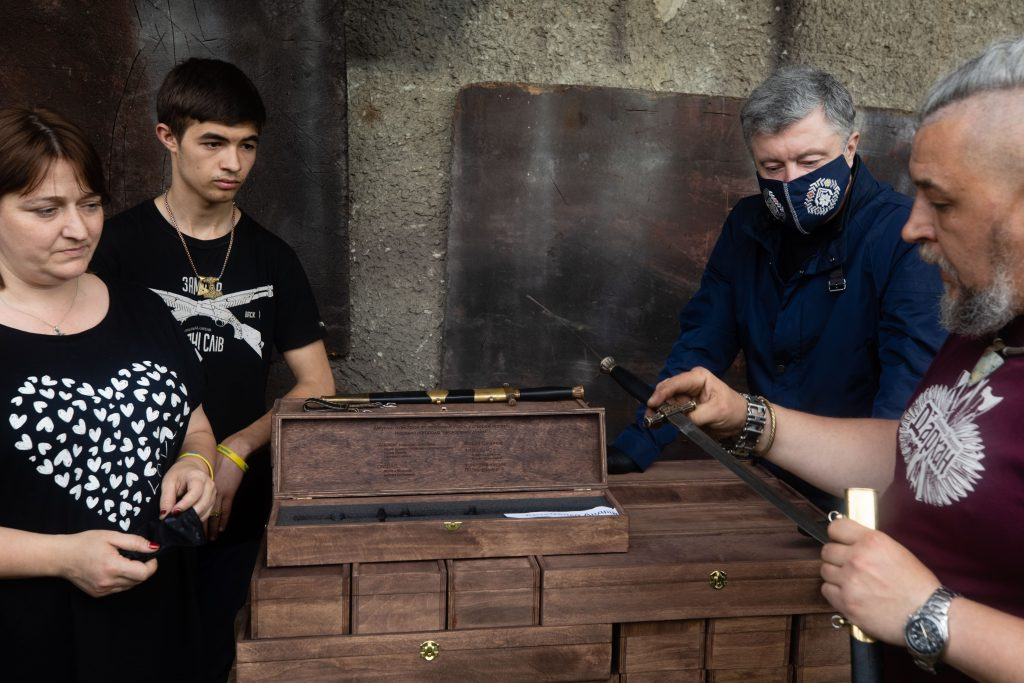 «У кузні «Дархан» родини Ейдерів у місті Надвірна твориться українська історія, гартується не лише сталь, а й чоловіча мужність. Саме тут батько військовополоненого моряка Андрія Ейдера виготовляє кортики для наших полонених моряків. Символічно, що вони були виготовлені із російських снарядів», – пише Петро Порошенко на своїй сторінці у Facebook.