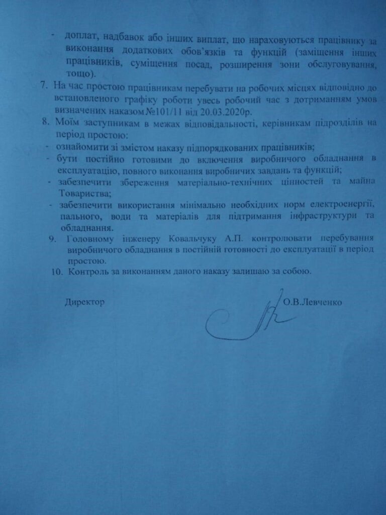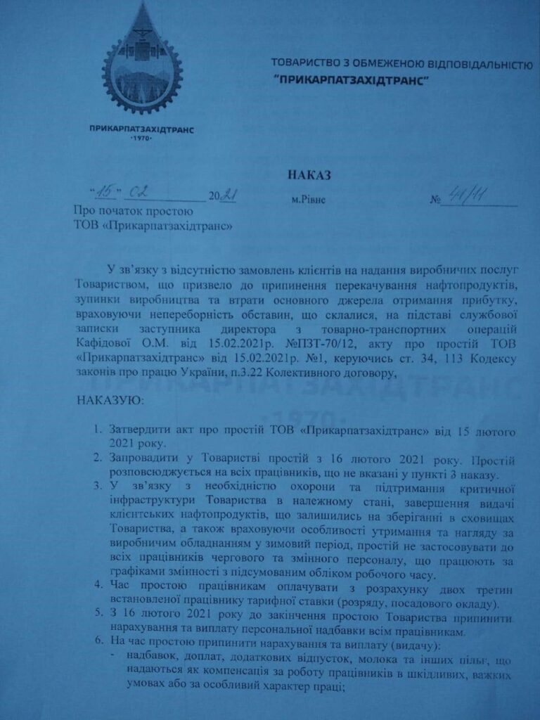 В розпорядженні громадської організації опинилися документи, які свідчать про початок простою в роботі ТОВ «Прикарпатзахідтранс» за декілька днів до введення санкцій – наказ 41/11 від 15.02.2021 року за підписом директора О.В. Левченко, згідно якого з 15 лютого 2021 року затверджується простій в роботі ТОВ «Прикарпатзахідтранс». Причина простою – відсутність замовлень клієнтів на надання виробничих послуг товариством.