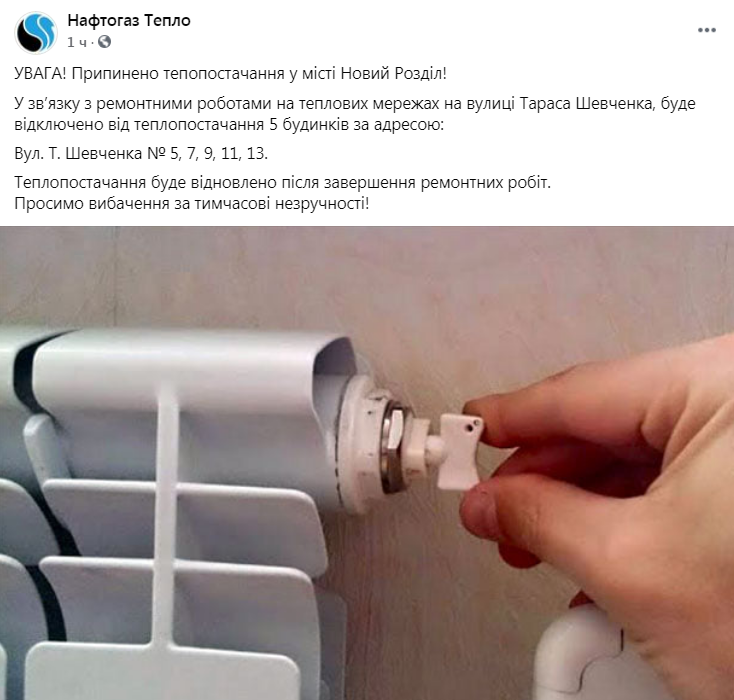 «У зв’язку з ремонтними роботами на теплових мережах на вулиці Тараса Шевченка, буде відключено від теплопостачання 5 будинків за адресою: Вул. Т. Шевченка № 5, 7, 9, 11, 13. Теплопостачання буде відновлено після завершення ремонтних робіт»,- зазначається у повідомленні.