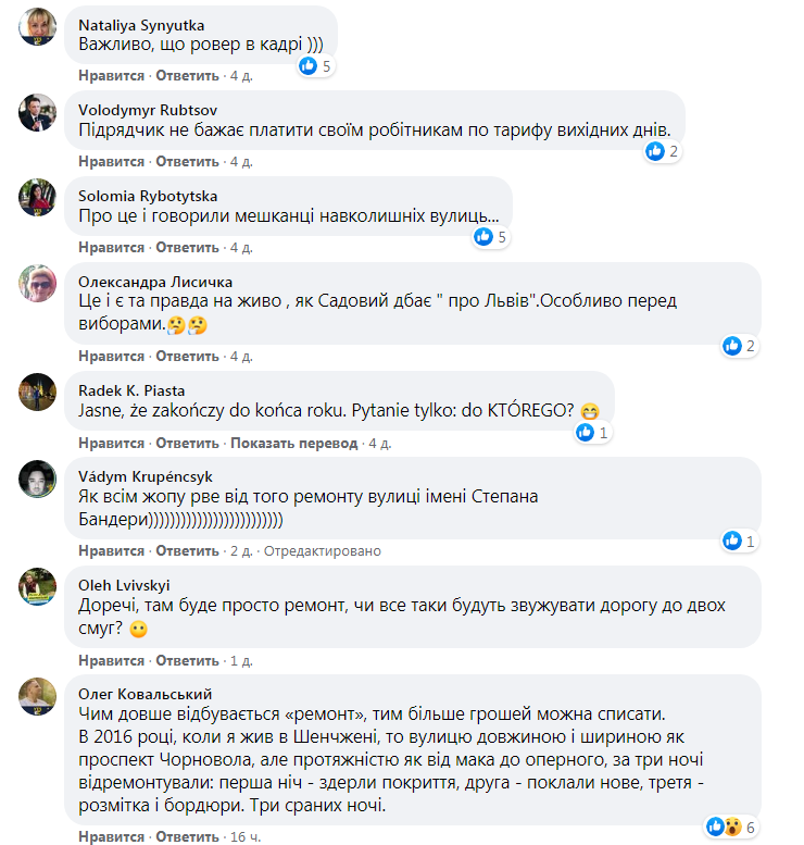 «Абсолютно не вірю я Садовому, який каже що ремонт вулиці Бандери закінчать до кінця року. Перекрили, розкопали і загоряють на сонці. Останніми днями роботі заважав дощ. Сьогодні гарний сонячний день, але як видно на фото працювати також не хочеться. А що далі? Далі буде зима, а львів’яни почекають. Тут ніхто нічим не переймається. Найважливіше, що при одному з найдорожчих ремонтів в Європі, 6 мільйонів євро за 1км, комусь щось завжди капне», – зазначив у своєму дописі Томаш Барт.