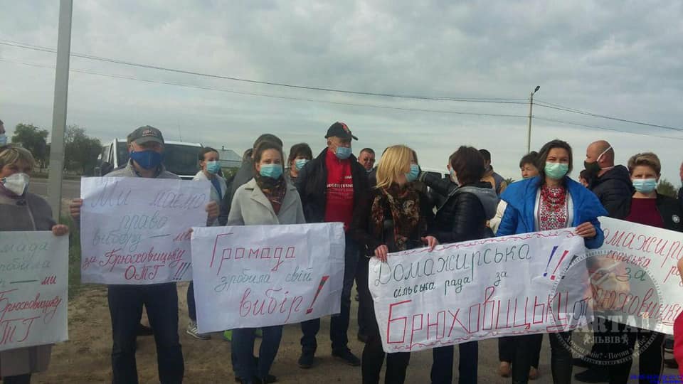 Як зазначається, “відбувається мирний захід символічного об’єднання громад, які мають намір створити Брюховицьку ОТГ. Обрано місце де проходить межа Домажирської та Рясна-Руської сільських рад. Як символ прагнення об’єднати громади, які роз’єднують Львівською ОТГ та ОТГ Івано-Франкове. Місце проведення с. Підрясне. Люди в масках. Дистанція є.