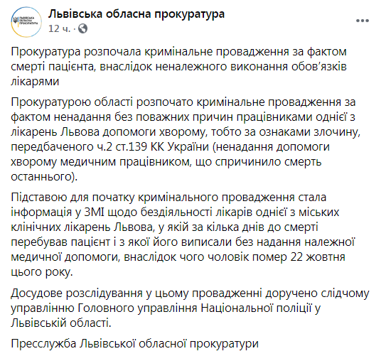 Як пише «Четверта студія», у прес-службі прокуратури Львівської області повідомили, що підставою для початку кримінального провадження стала інформація у ЗМІ щодо бездіяльності лікарів однієї з міських клінічних лікарень Львова, у якій за кілька днів до смерті перебував пацієнт і з якої його виписали без надання належної медичної допомоги, внаслідок чого чоловік помер 22 жовтня цього року.