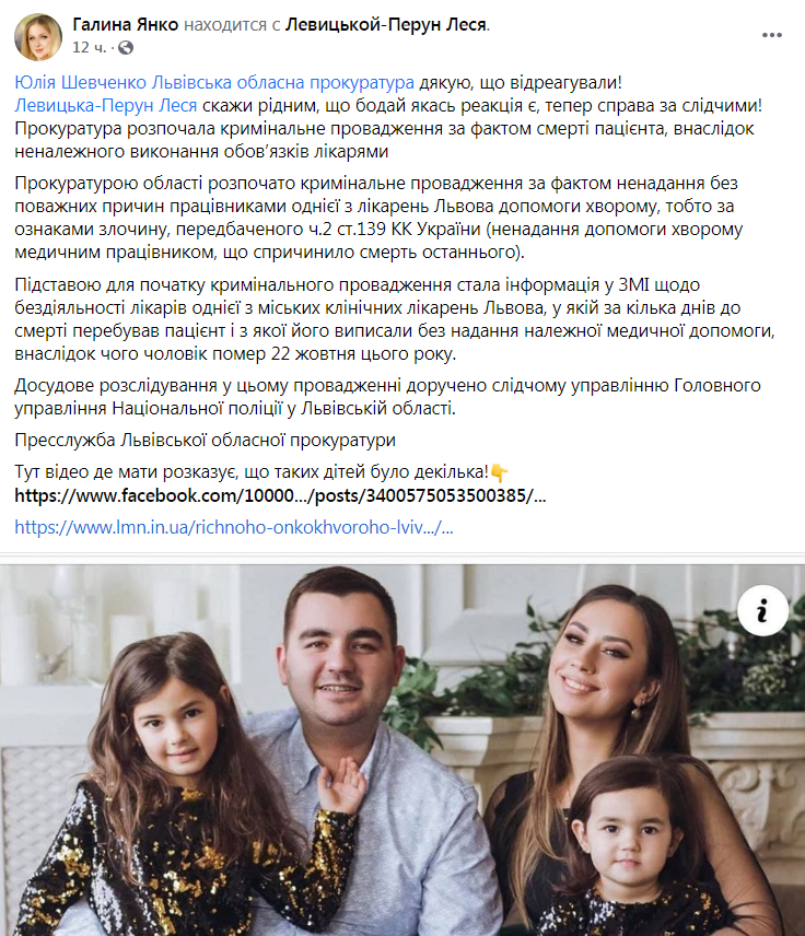 «Дякую, що відреагували! Левицька-Перун Леся скажи рідним, що бодай якась реакція є, тепер справа за слідчими. Прокуратура розпочала кримінальне провадження за фактом смерті пацієнта, внаслідок неналежного виконання обов’язків лікарями», – написала на своїй сторінці у ФБ Галина Янко.