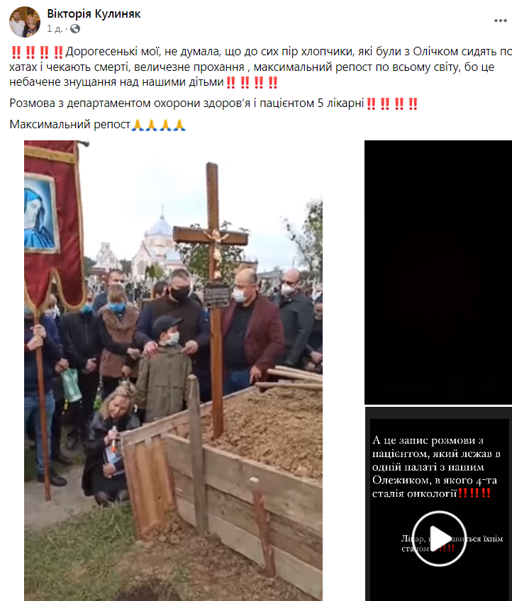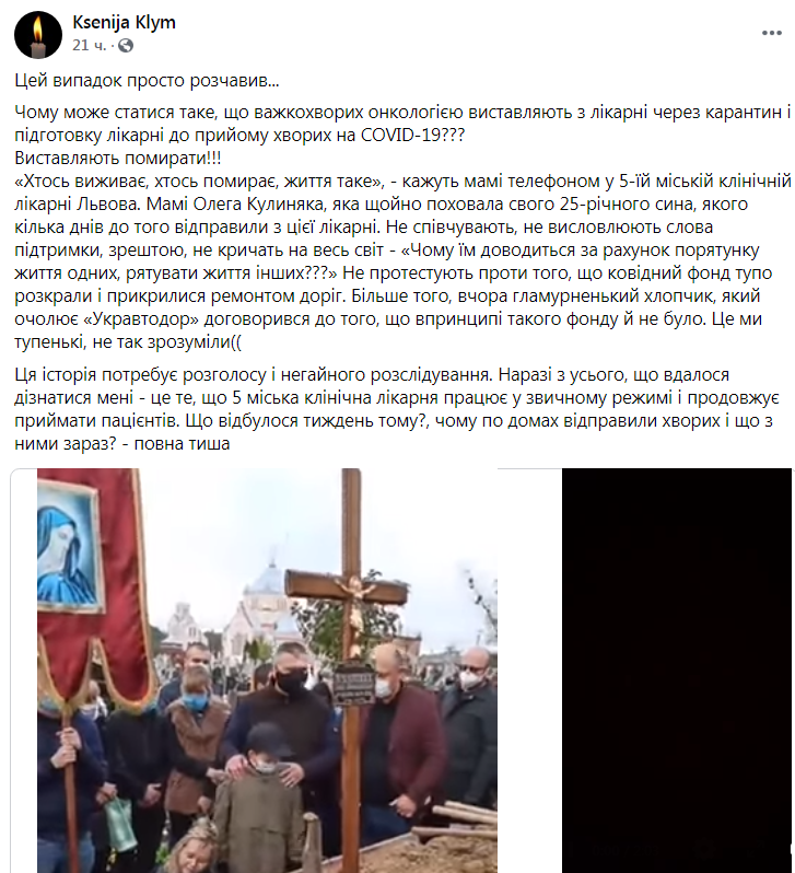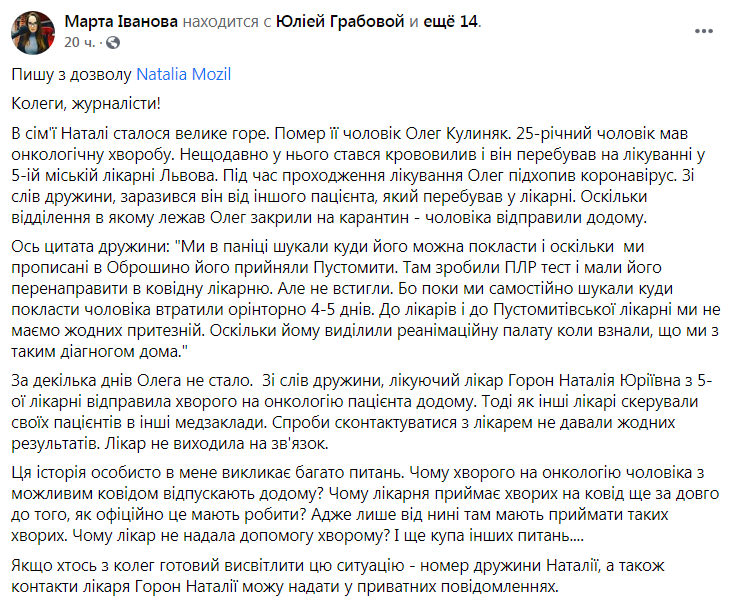 «Колеги, журналісти! В сім’ї Наталі сталося велике горе. Помер її чоловік Олег Кулиняк. 25-річний чоловік мав онкологічну хворобу. Нещодавно у нього стався крововилив і він перебував на лікуванні у 5-ій міській лікарні Львова. Під час проходження лікування Олег підхопив коронавірус. Зі слів дружини, заразився він від іншого пацієнта, який перебував у лікарні. Оскільки відділення в якому лежав Олег закрили на карантин – чоловіка відправили додому.