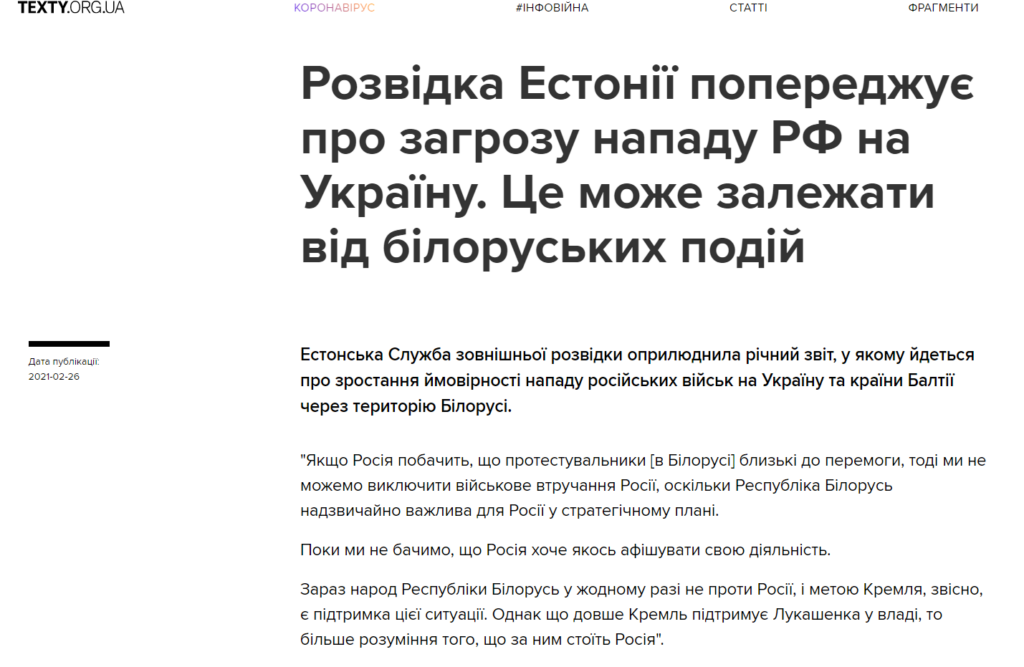 Естонська Служба зовнішньої розвідки оприлюднила річний звіт, у якому йдеться про зростання ймовірності нападу російських військ на Україну та країни Балтії через територію Білорусі.