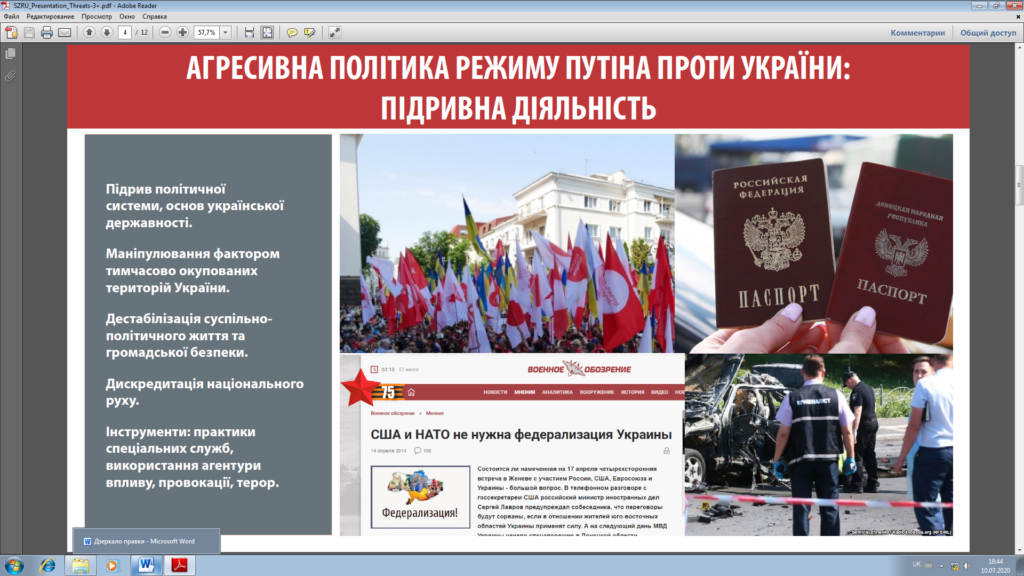Ми фіксуємо спроби російських спецслужб проводити спеціальні операції для внесення розбрату в українське суспільство та підриву основ української державності. Ставка робиться на системну дискредитацію української національної ідеї і західного цивілізаційного вибору, демонстрацію «штучності української ідентичності та держави» (останнім часом цей дискурс нам нав’язують як ззовні, так і зсередини). Москва активно маніпулює фактором тимчасово окупованих територій, намагаючись протиставити народ України і «київську владу», що нібито зрадила передвиборні обіцянки стосовно довгоочікуваного миру у Донбасі.