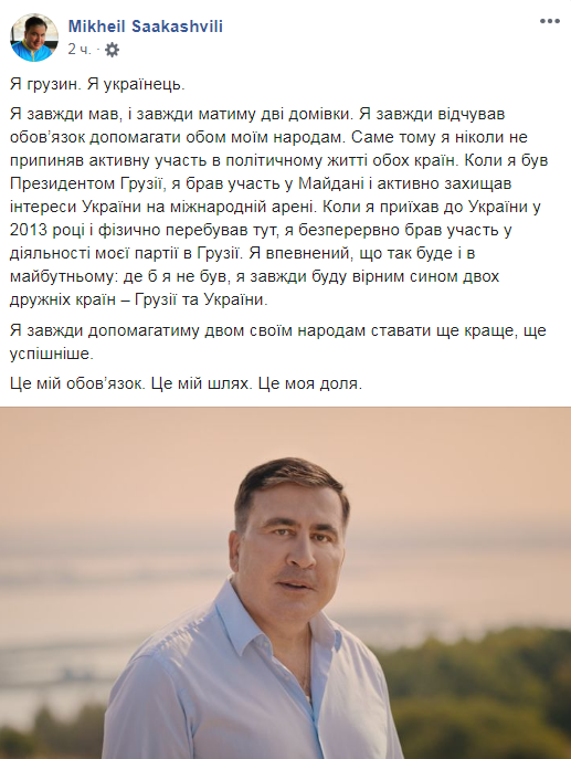 «Я завжди мав, і завжди матиму дві домівки. Я завжди відчував обов’язок допомагати обом моїм народам. Саме тому я ніколи не припиняв активну участь в політичному житті обох країн. Коли я був Президентом Грузії, я брав участь у Майдані і активно захищав інтереси України на міжнародній арені. Коли я приїхав до України у 2013 році і фізично перебував тут, я безперервно брав участь у діяльності моєї партії в Грузії. Я впевнений, що так буде і в майбутньому: де б я не був, я завжди буду вірним сином двох дружніх країн – Грузії та України», – йдеться у пості Саакашвілі 27 серпня.