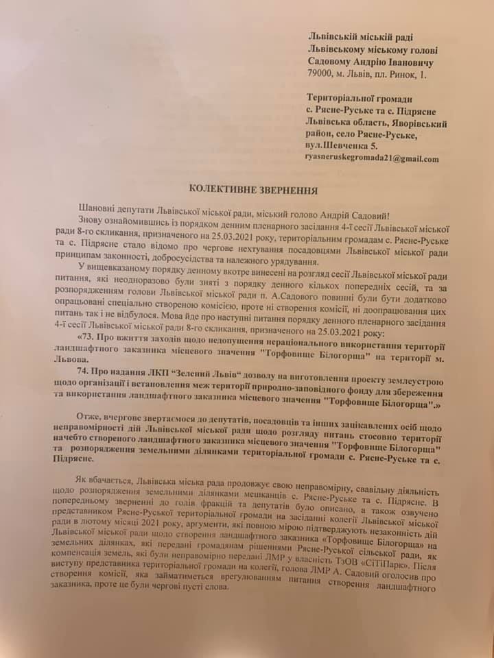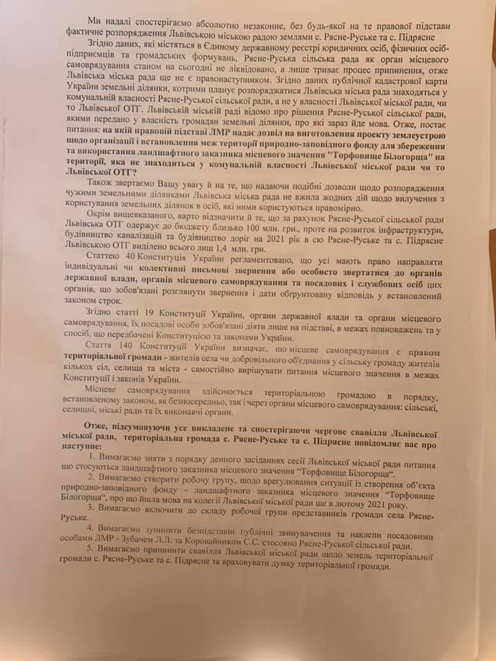 Також у дописі йдеться, що «про незаконність дій Львівської міської ради щодо створення ландшафтного заказника «Торфовище Білогорща» ми вже говорили на засіданні колегії Львівської міської ради, у лютому 2021 року. За розпорядженням голови Львівської міської ради п. А. Садового ці питання повинні були бути додатково опрацьовані спеціально створеною комісією. Проте, ні створення комісії, ні доопрацювання цих питань так і не відбулося».