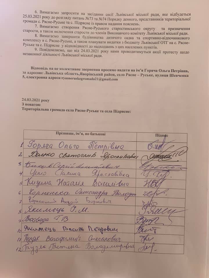 «Тому громада с. Рясне-Руське та с. Підрясне завтра, 25 березня, об 11:00 пікетуватиме сесію ЛМР. Зокрема, вимагаємо зняти ці питання з порядку денного, створити робочу групу, із залученням представників громади, для врегулювання цієї ситуації», – наголошує Хацко.